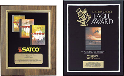 Full color award plaques in short runs or large quantities. With our exclusive process we transform your four color art, photography, or graphics into a full color reproduction embedded under an acrylic panel. No multiple color screen and color matching charges. Award copy is imprinted onto a silver or gold tone plate. Sizes from 6”x8” to 12”x15” available in simulated wood or stone finishes.