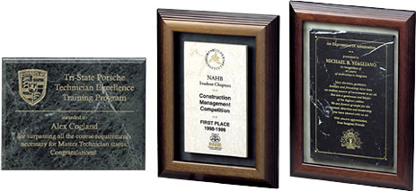 ETCHED MARBLE SERIES CONTINUED EM Style Marble Plaques feature Jade Marble Panel with sculpted edge. Etching and one color fill (gold or silver standard). 2 sizes - 6”x8” & 8”x10”.