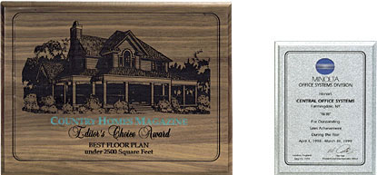 | LASER ENGRAVED CONTINUED Our precision laser engraving into a solid walnut or cherry panel produces a classic award plaque. Highlights in gold, silver or color can also be applied. Simulated finishes available for laser engraving include oak, walnut and granite. | |