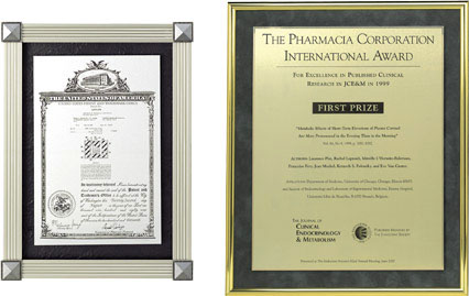 Ideal for precise reproduction of highly detailed graphics, photos, diplomas, patents or newspaper articles. Your award copy is reproduced in exacting detail on a gold or silver tone plate and floated on a background of slate laminate or brushed suede in choice of color. Each style available in three sizes 8”x10”, 9”x12” and 12”x15”. PF200 and PF400 available in gold or silver finish. PF100 in