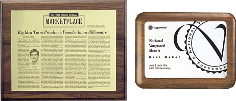 | PHOTO-METAL CONTINUED Ideal for precise reproduction of highly detailed graphics, photos, diplomas, patents or newspaper articles. Plates are mounted on solid walnut or simulated finish plaques in granite, walnut or black. Available with bright gold or silver border accent plates.